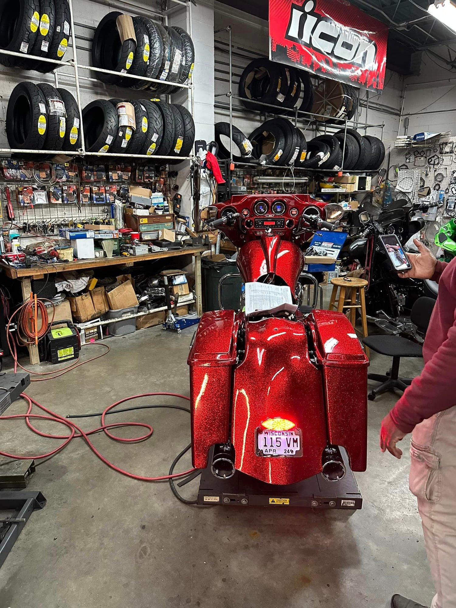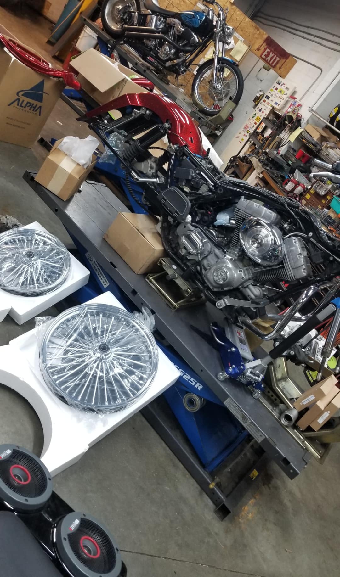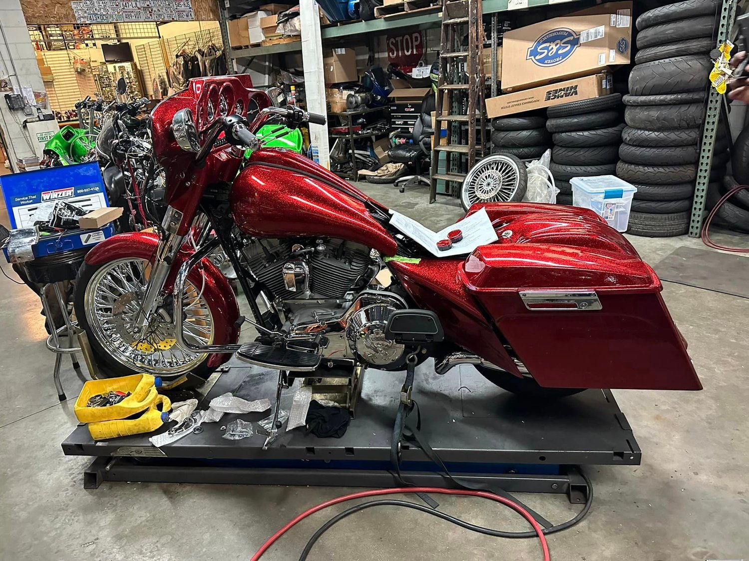 Aptly named after Dorothy’s Ruby Red Slippers. I bought her from my dad, took her apart and over the course of a few years and with the help of my bike builder, she was rebuilt from the ground up and I have about 80 hours and 20 coats of glitter flake paint invested into her.